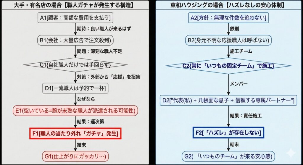 これが、大手特有の「職人の当たり外れ(ガチャ)」の正体です。 東和ハウジングには「ハズレ」がありません、私たちは、身元の知れない応援職人を呼んでまで、無理に工事件数を増やすことはしません。