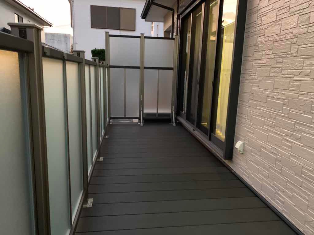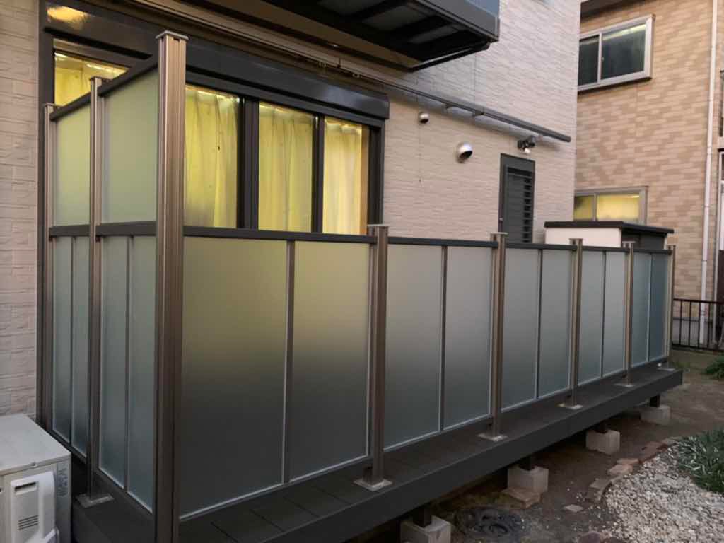 デッキの周囲には、すりガラス調のパネルフェンスを取り付けました。外からの視線はしっかり遮りつつも、光は通すため、足元が暗くなりません。