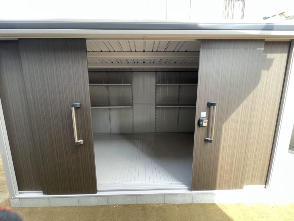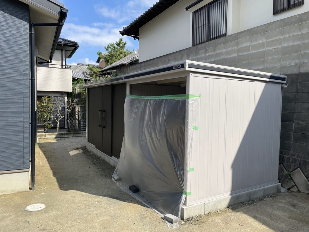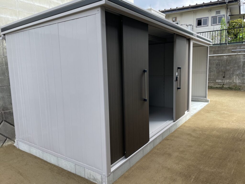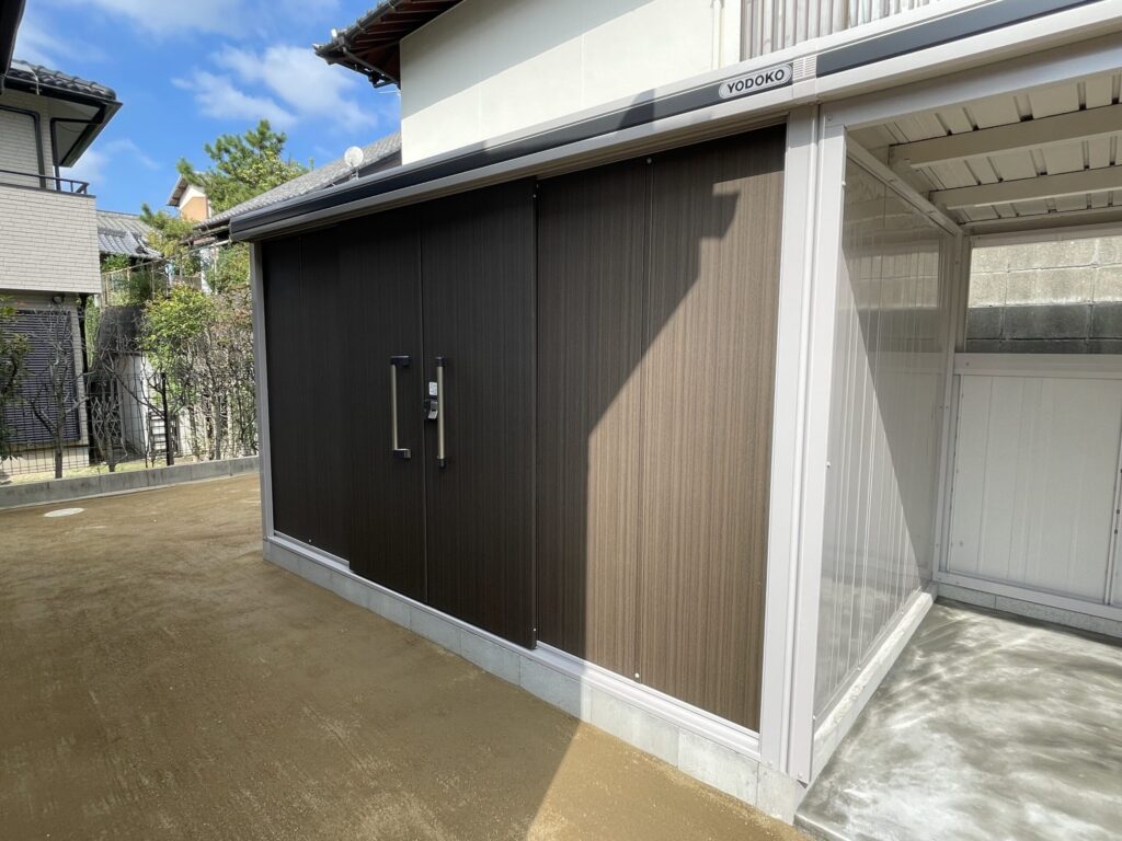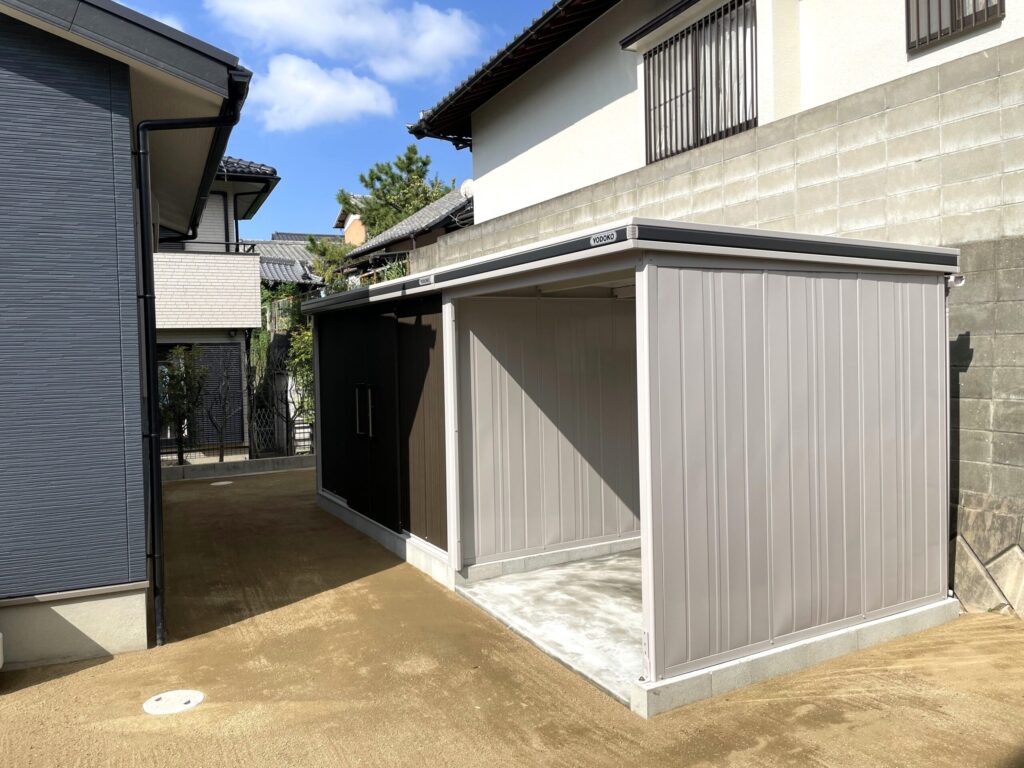 収納と駐輪スペースがセットになった「エルモコンビ(ヨドコウ製)」の設置工事を行いました。