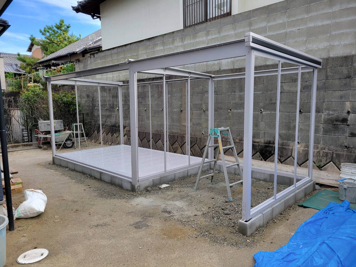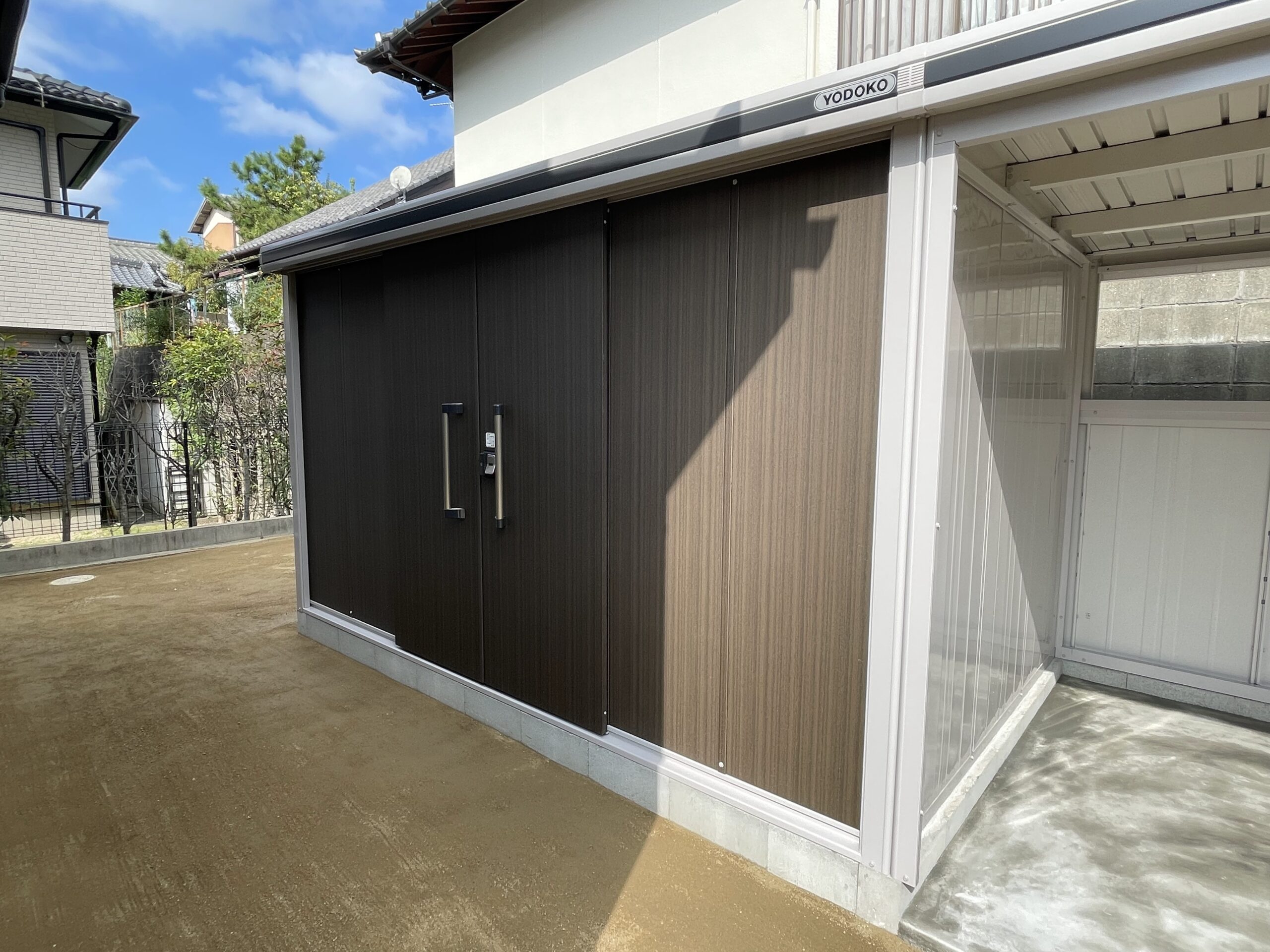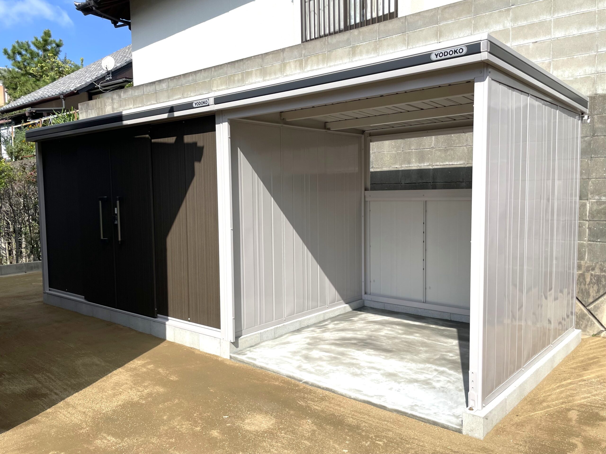 収納と駐輪スペースがセットになった「エルモコンビ(ヨドコウ製)」の設置工事を行いました。