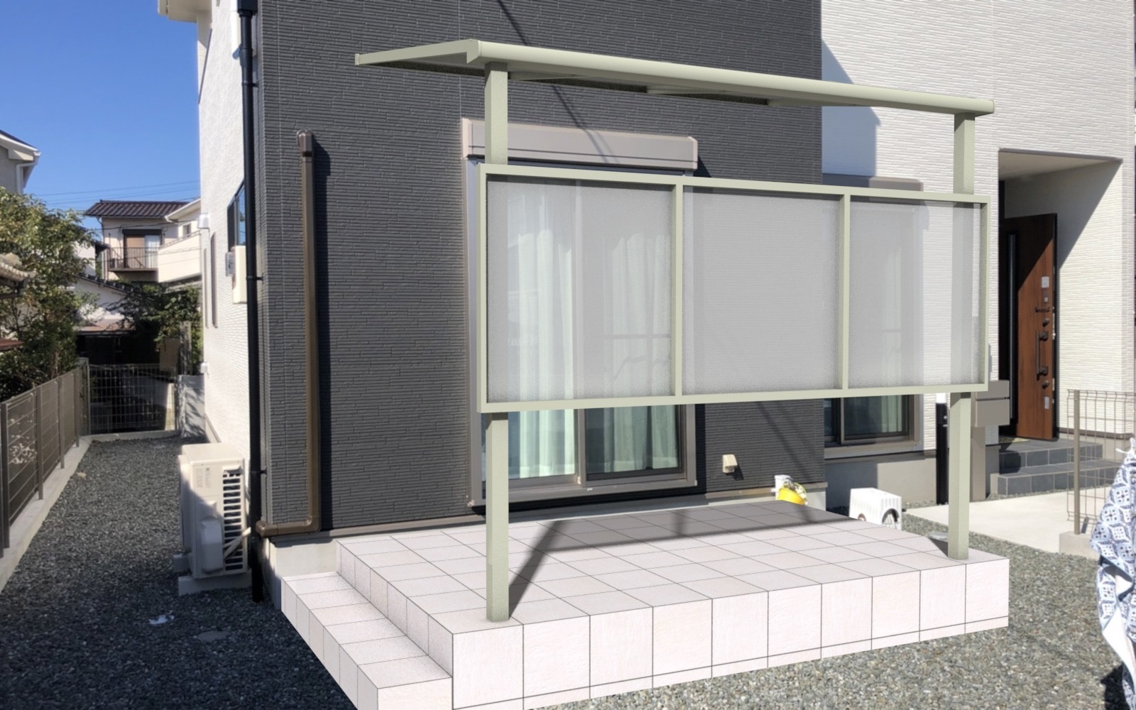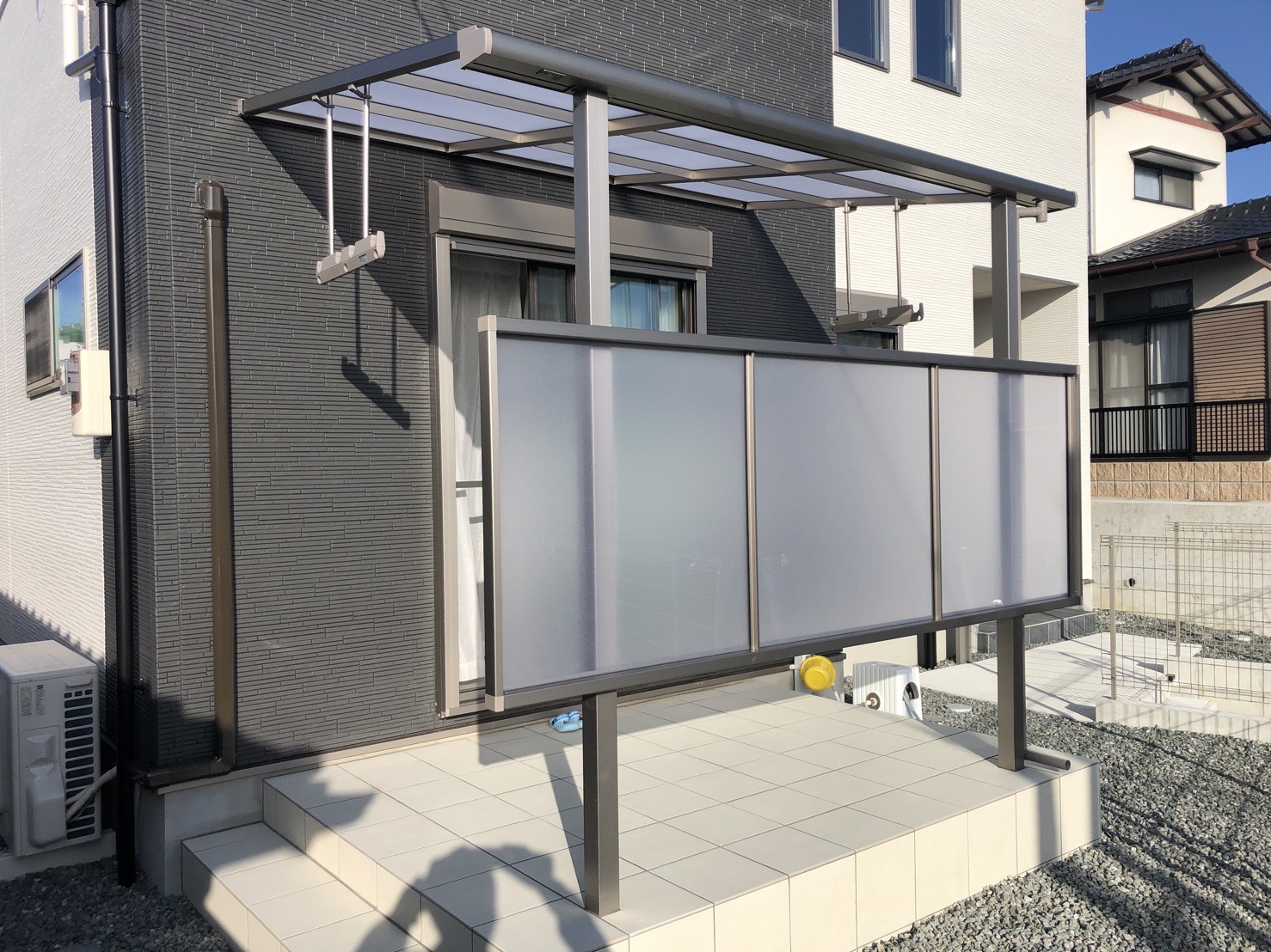 建物の雰囲気に合わせ、フラットでモダンな「Fタイプ」の屋根と、プライバシーを守る前面スクリーンをご提案。