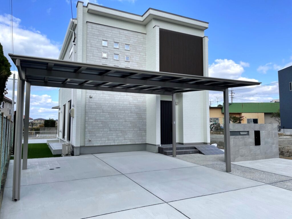 駐車スペースは、お車2台をゆったりと停められるカーポートを設置し、全面をコンクリートで舗装しました。単調にならないよう、アプローチ部分には「コンクリートの洗い出し(石の粒を浮き出させる手法)」を施し、質感を変えることで自然な動線を描いています。