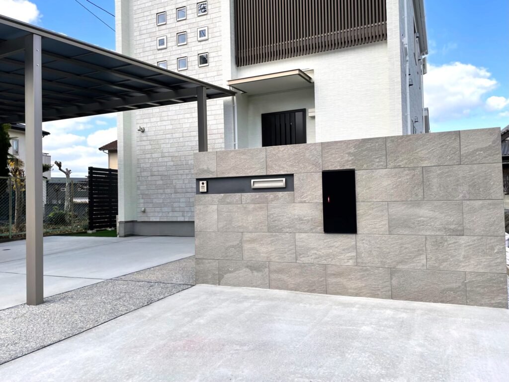 今回の外構の顔となるのは、正面に構えた迫力のある「造作門柱」です。300×600の大判タイルを丁寧に張り合わせて仕上げました。建物の外観を引き立てるこのスタイルは、当店でも非常に多くのお客様からご好評をいただいております。