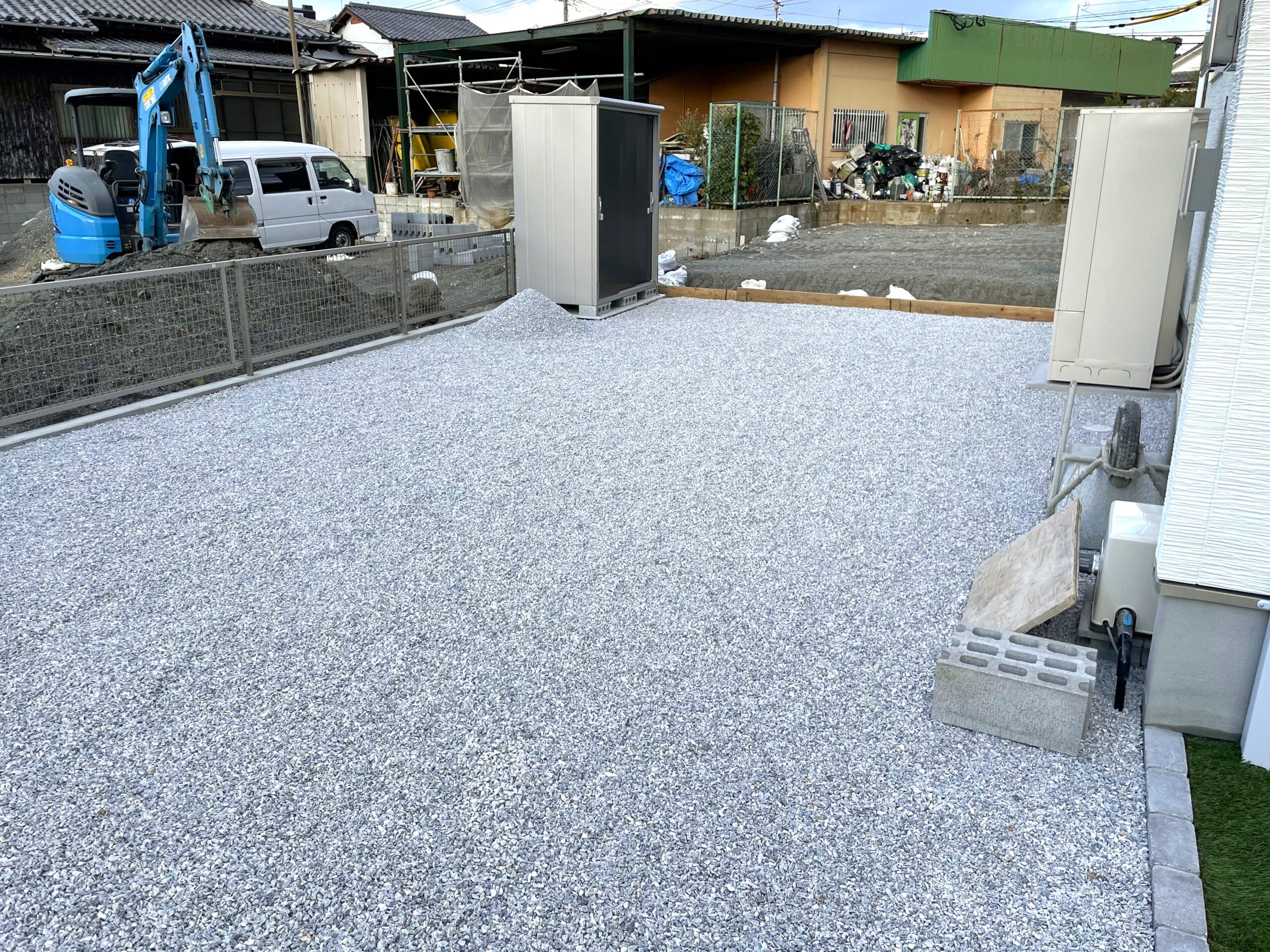 一方で、普段目に触れない家の真裏は、全面を防草シートと砂利敷きで仕上げています。広範囲の雑草対策としてコストパフォーマンスに優れ、今後のお手入れの負担を大幅に軽減できます。