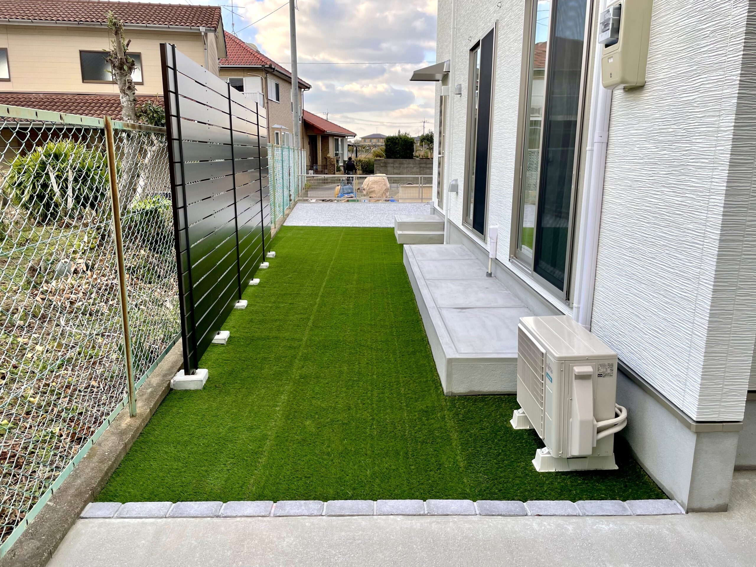 勝手口から続くお庭には、人工芝と背の高い目隠しフェンスを設置してプライベートな空間を充実させました。