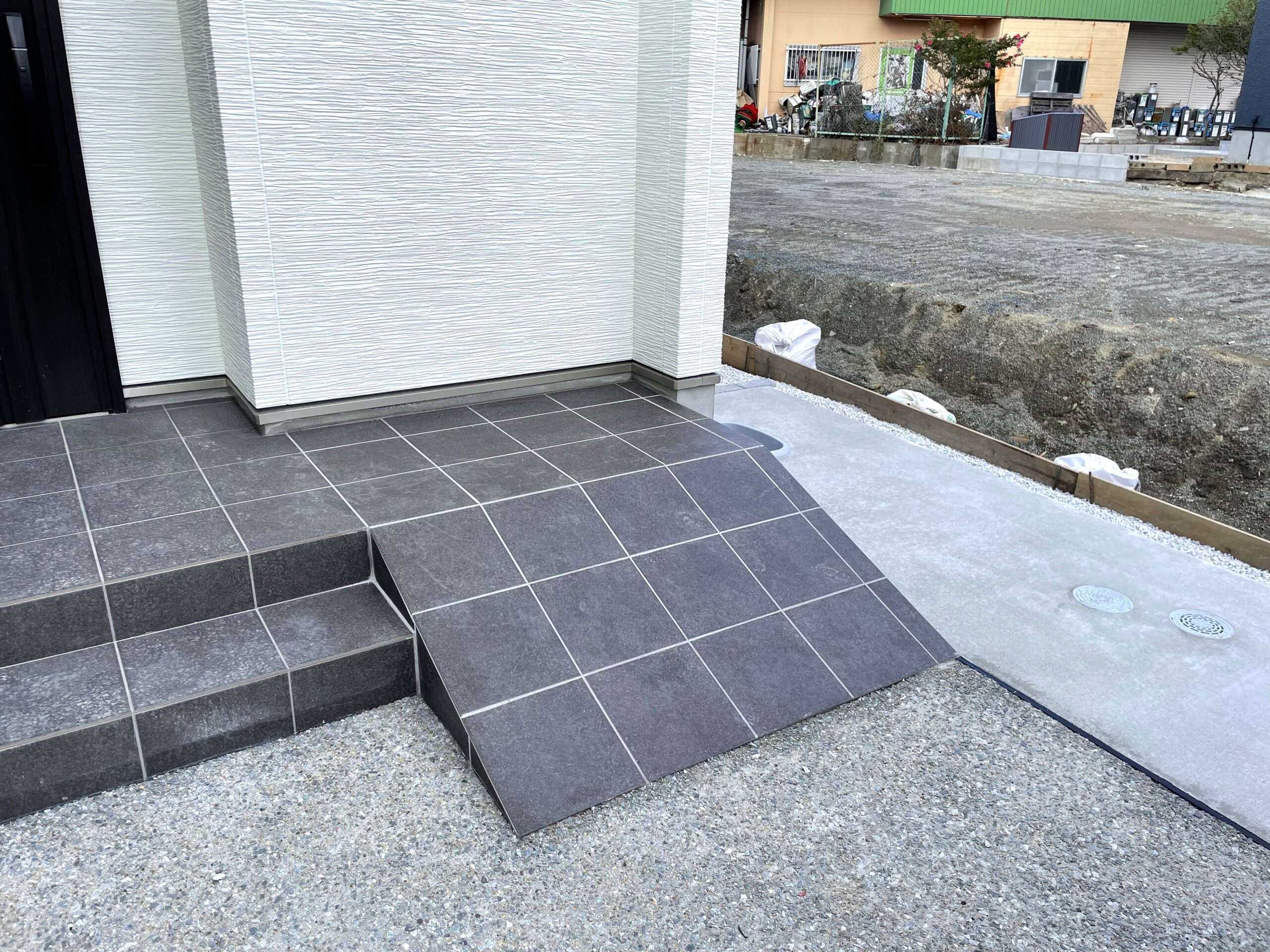 今回の外構の顔となるのは、正面に構えた迫力のある「造作門柱」です。300×600の大判タイルを丁寧に張り合わせて仕上げました。建物の外観を引き立てるこのスタイルは、当店でも非常に多くのお客様からご好評をいただいております。