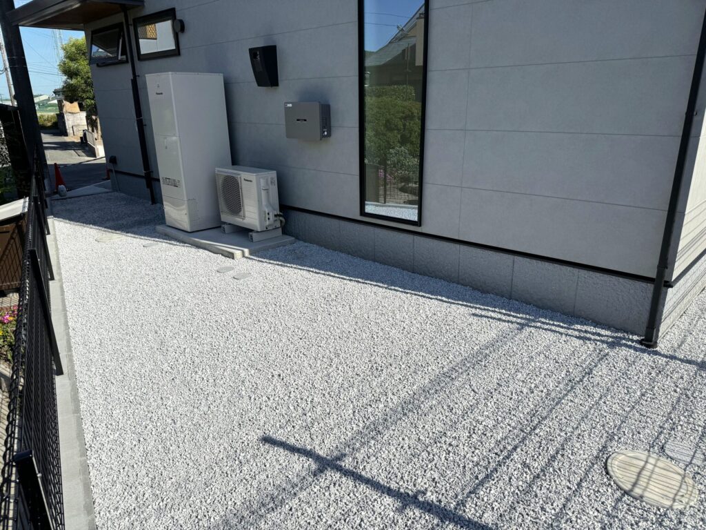 建物の裏手などは、防草シートと砂利敷きで仕上げました。普段目が届きにくい場所だからこそ、雑草対策を徹底し、メンテナンスの手間を減らすよう配慮しております。