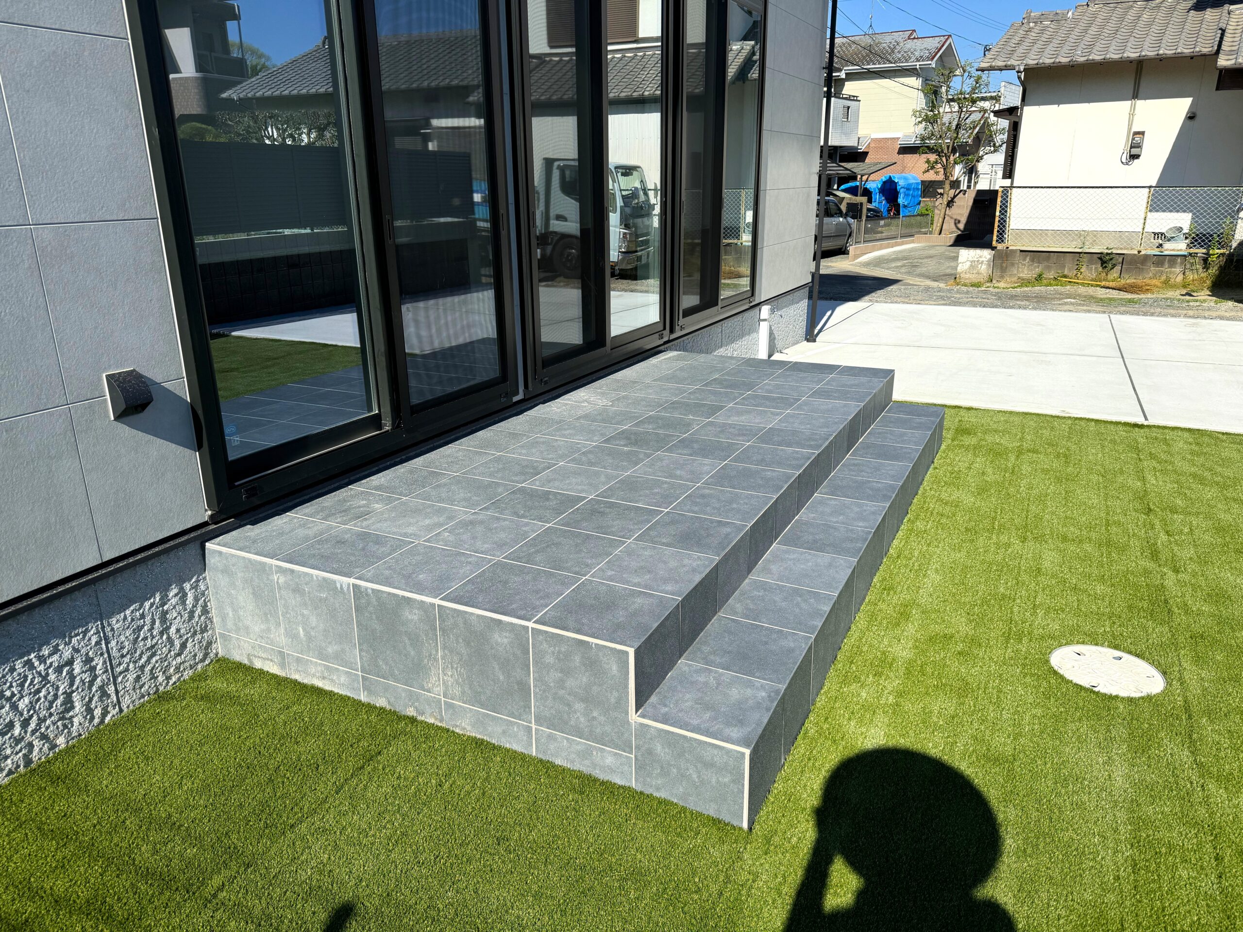リビングの掃き出し窓からフラットにつながる「タイルデッキ」を設置しました。その先には鮮やかな人工芝を敷き詰め、室内と屋外に一体感を持たせています。 - 建物外周: