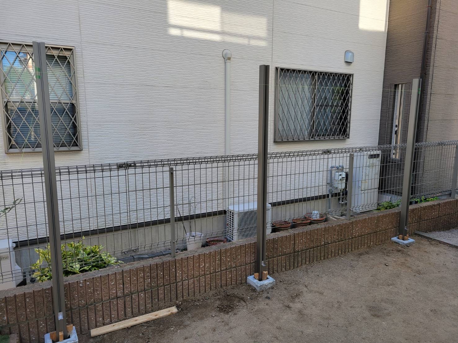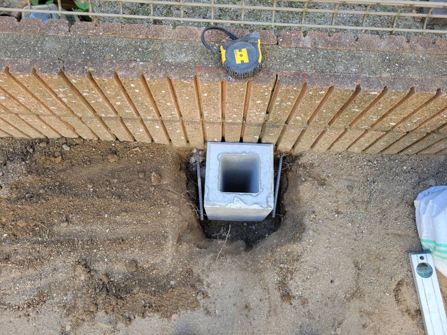 樹木を抜いた後の地面に、コンクリートブロックの基礎を埋め込み(独立基礎)、フェンスの柱をしっかりと固定しました。