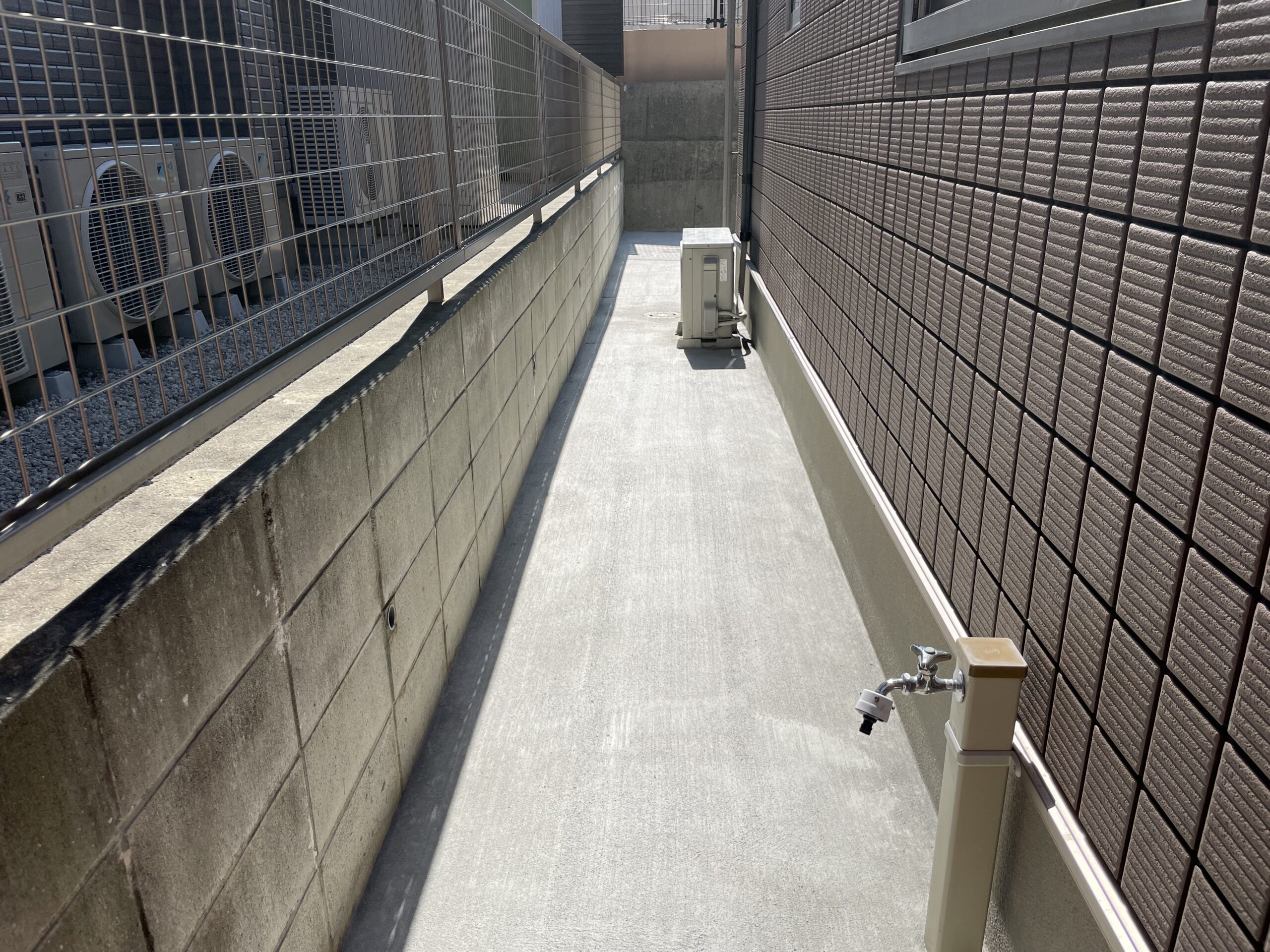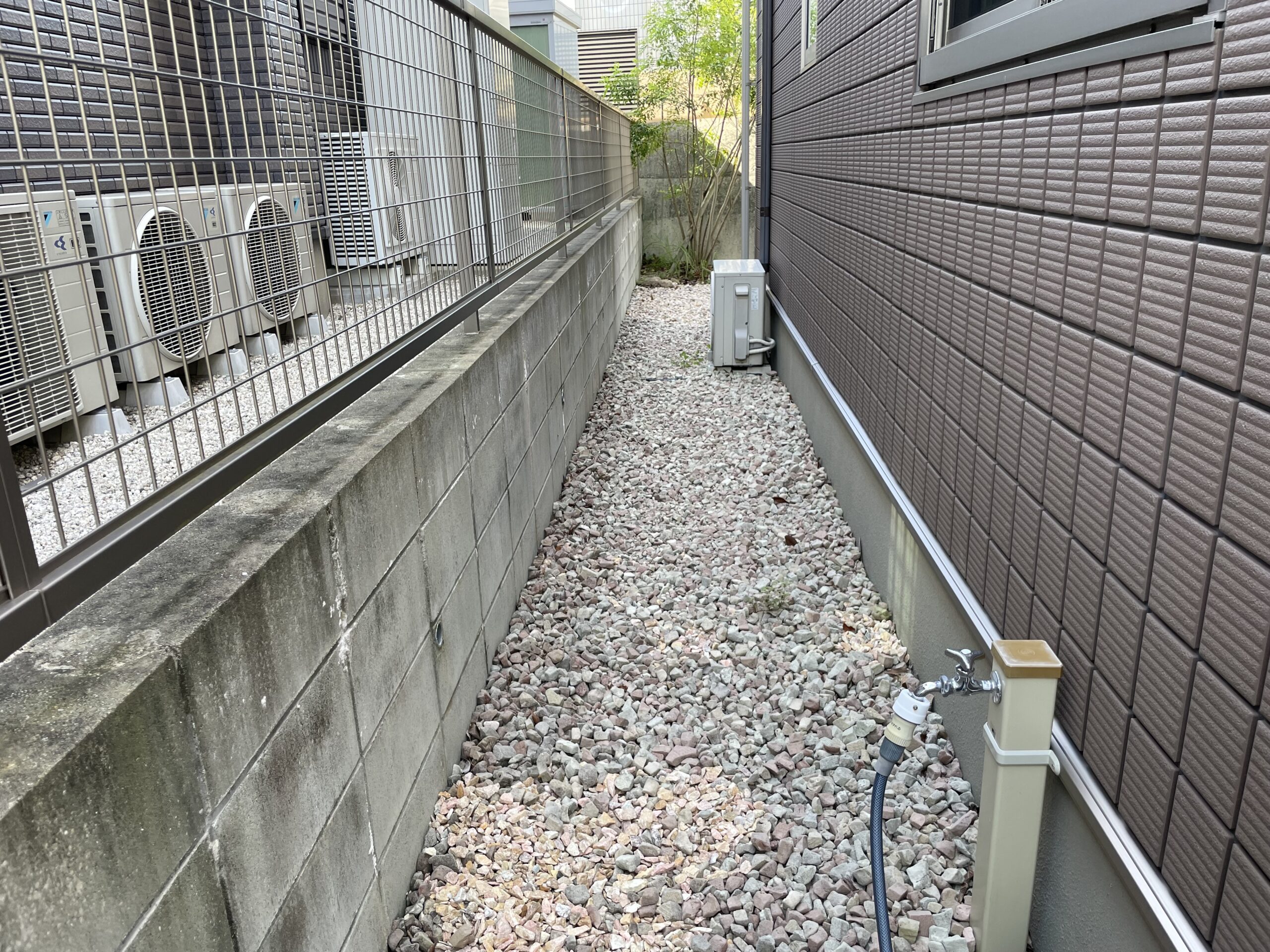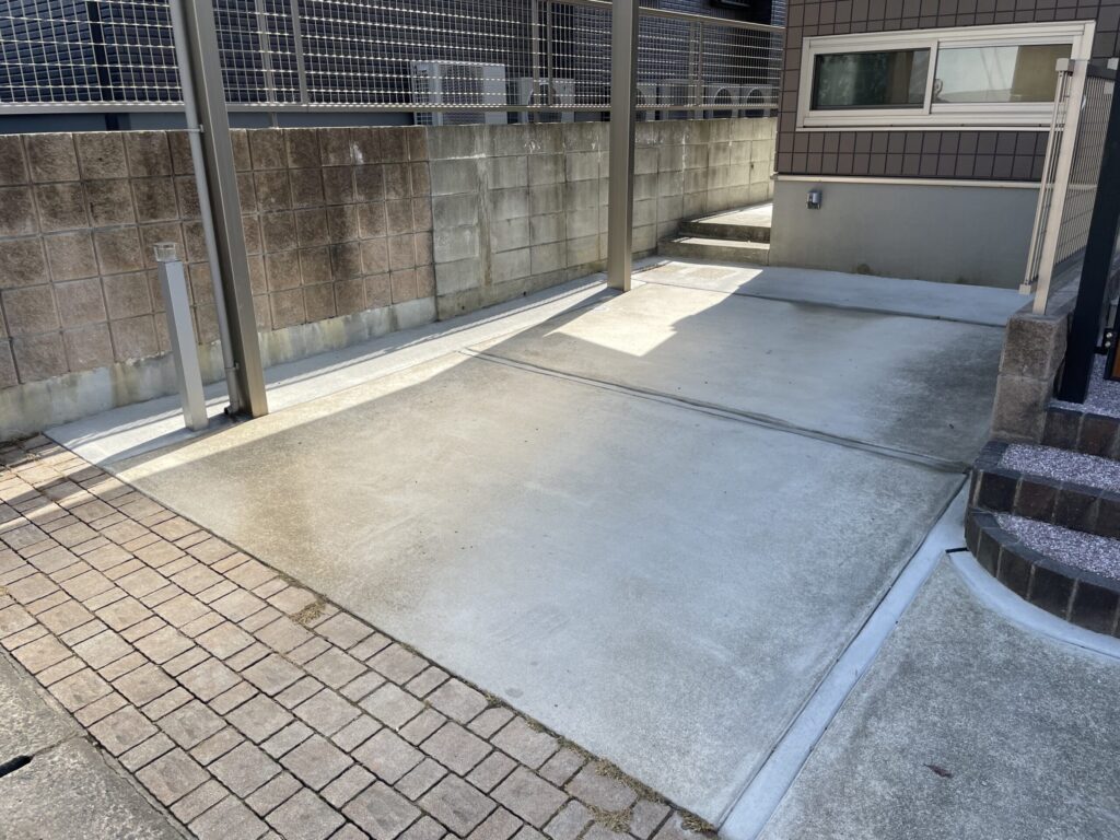 部分的な対策ではなく、今回は思い切って**「家周り(犬走り)」から「駐車場の目地」に至るまで、土の部分をすべてコンクリートやタイルで舗装**させていただきました。