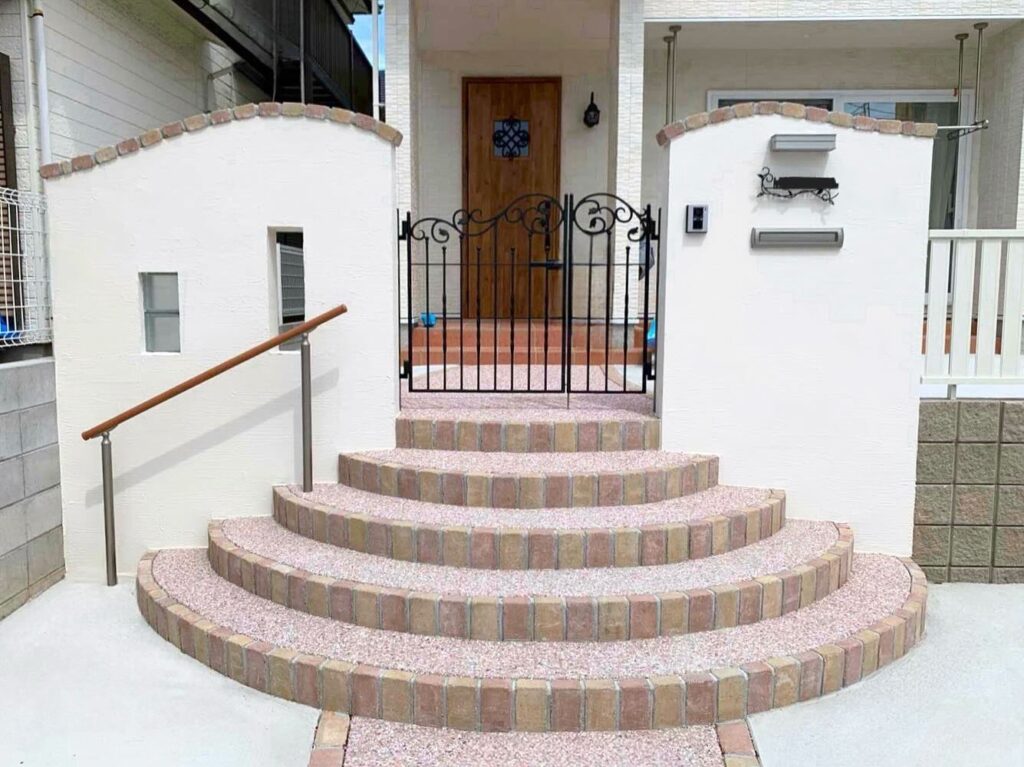 職人の手仕事による**「塗り壁(ジョリパット)」**や、アンティークレンガ、乱形石などを組み合わせ、温かみのあるアプローチを演出します。洋風の住宅にぴったりです。