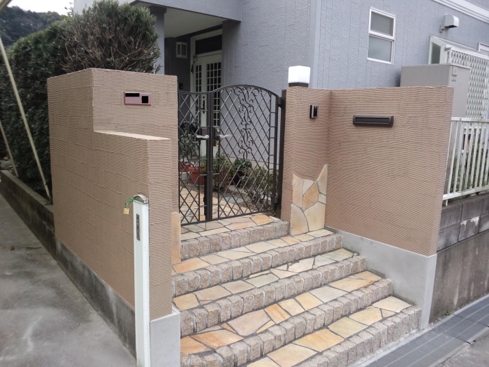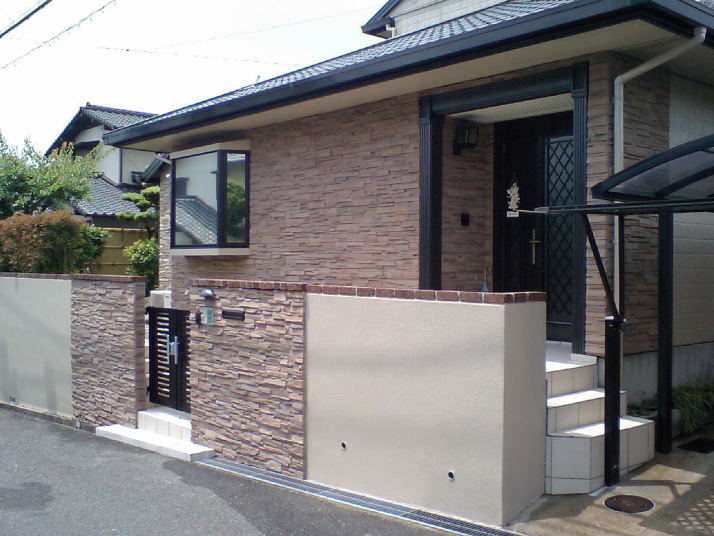 建物外壁及び門塀を石貼りで仕上げ、門扉・ポスト・表札などを交換。階段アプローチのタイルを貼り替え