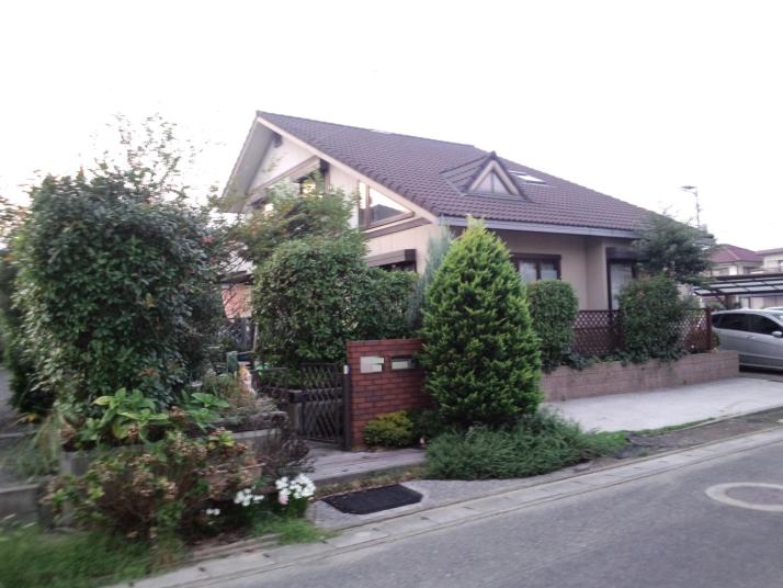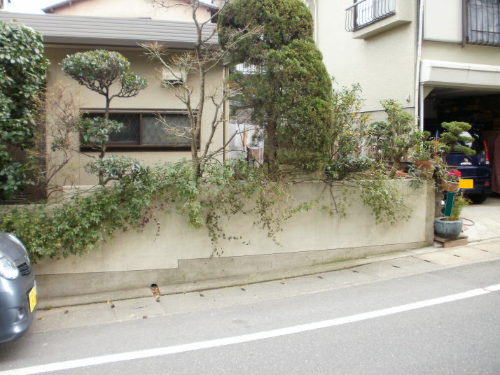 既存の門まわりと車庫を解体後、車庫を増設、門塀アプローチをリニューアル、既存の樹木や庭石を利用して築山を作成。