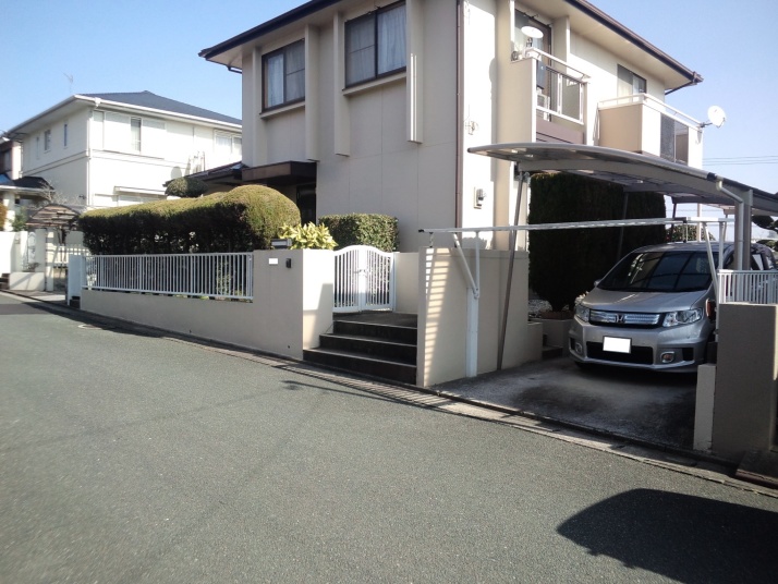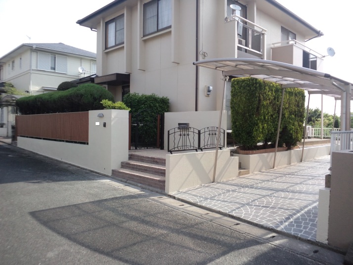041福岡県福津市リフォーム外構工事完了 車庫拡幅し既存フェンスを再設置、カーポート・門塀・階段リニューアル。車庫拡幅にあわせ歩道切り下げ。 |