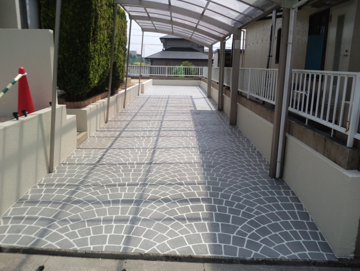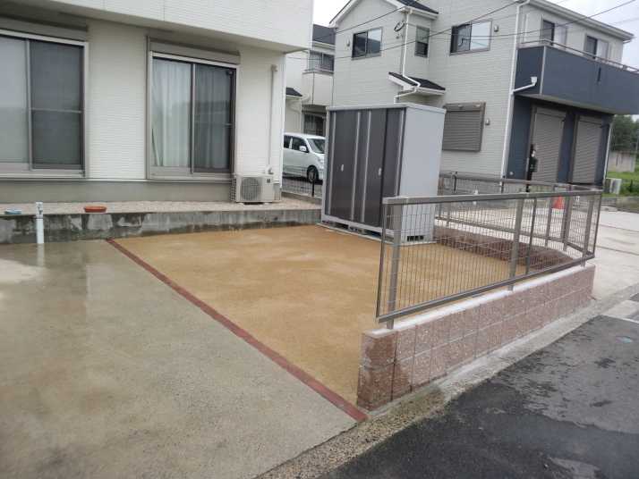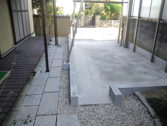 038福岡県宗像市リフォーム外構工事完了 車庫奥の樹木を撤去してコンクリートを延長、既存のコンクリート部分をふくめ、ライズ工法で模様を付けました。 |