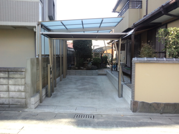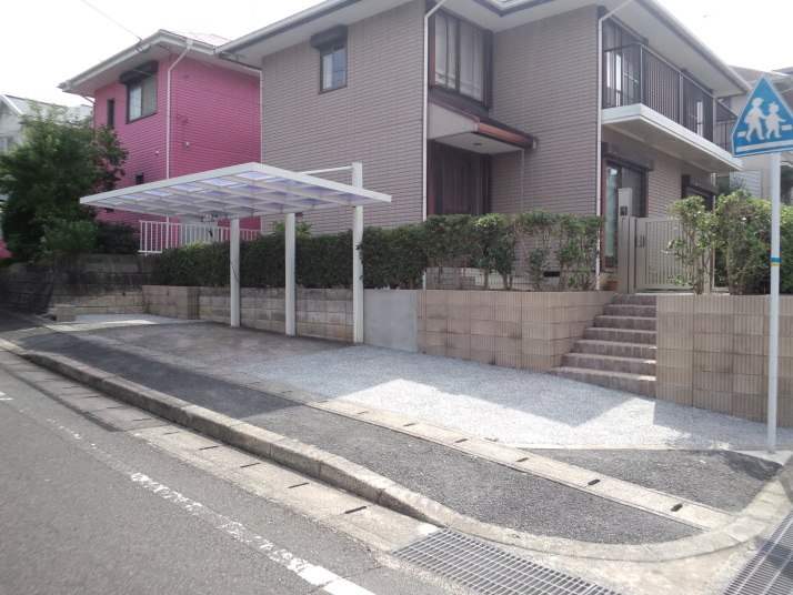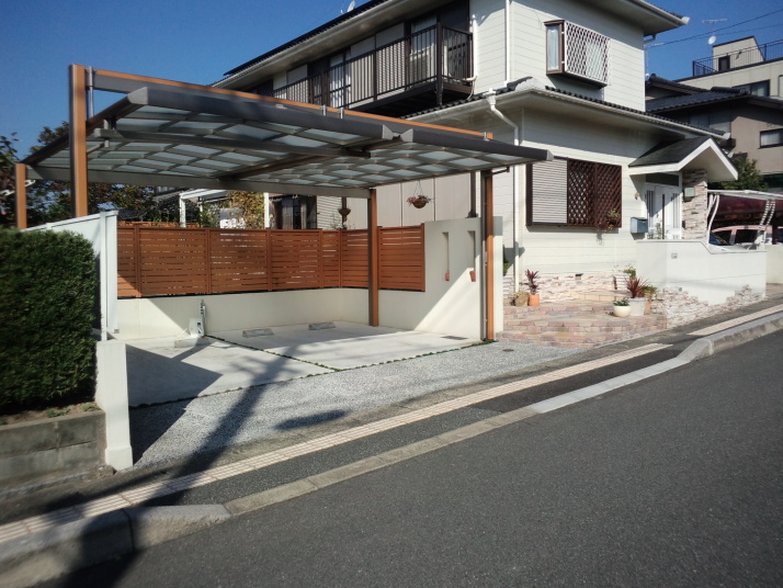 039福岡市東区リフォーム外構工事完了 既存塀を解体して車庫を新設、カーポートサイドパネル付で目隠し、電動オーバードアで防犯性を考慮して施工しました |