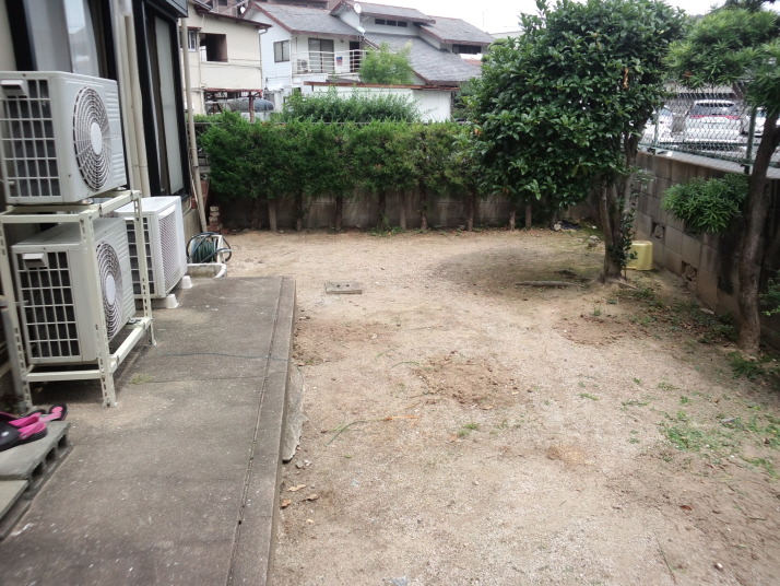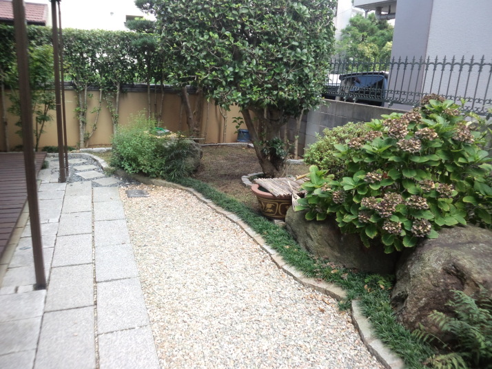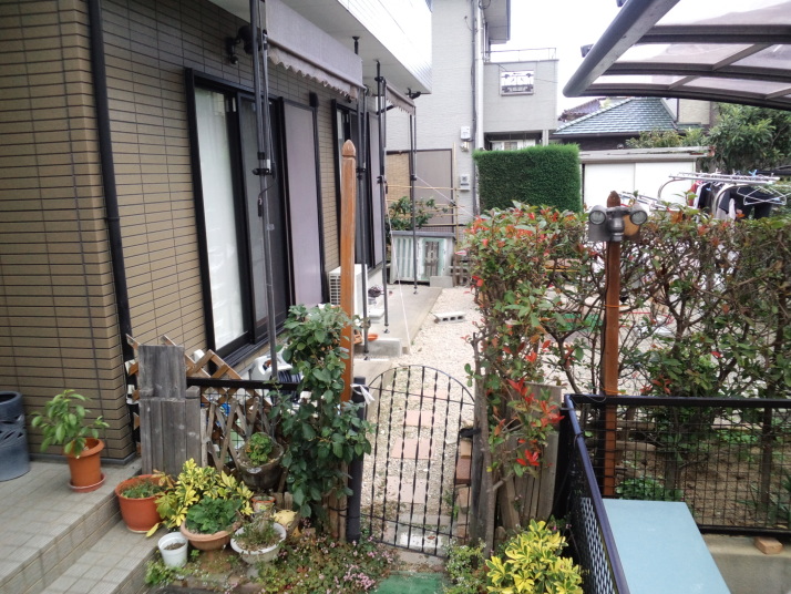 039福岡市東区リフォーム外構工事着工前 主なご要望 家の裏の車庫が小型車しか入れないので、車庫を新たに作りたい。 リビング前なので防犯、目隠しも兼ねて |