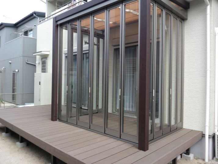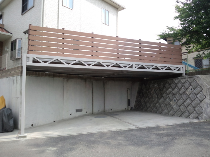 042福岡県糟屋郡新宮町リフォーム外構完了 既存フェンスとブロックを1段解体して、車庫上部を鉄骨で組み、樹脂製のウッドデッキとフェンスを施工 |