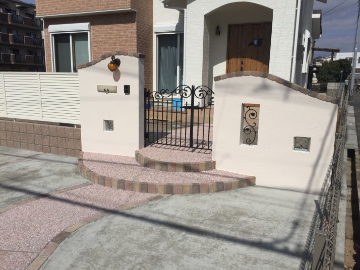 門塀ジョリパット仕上げ、ミルドブリック笠木、