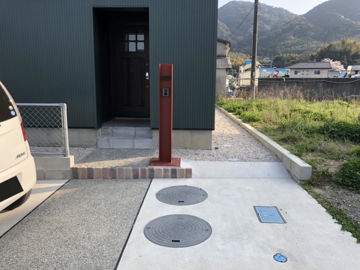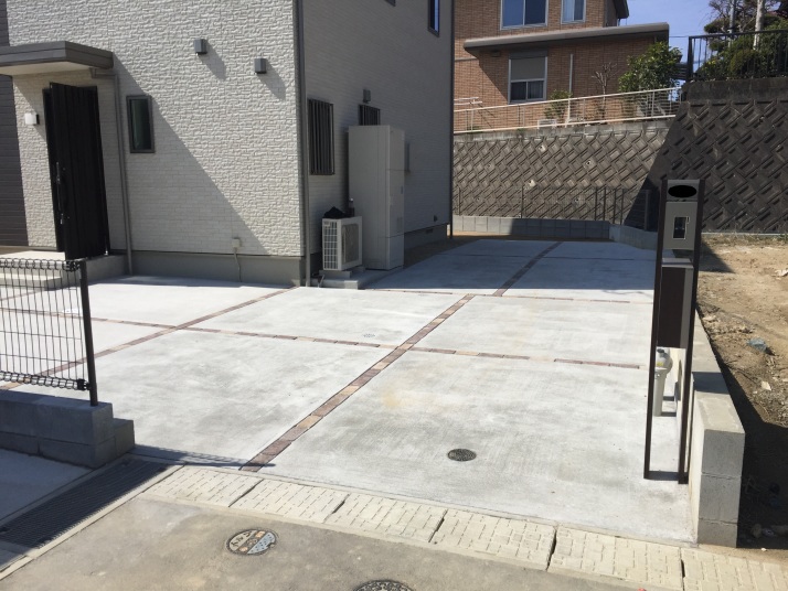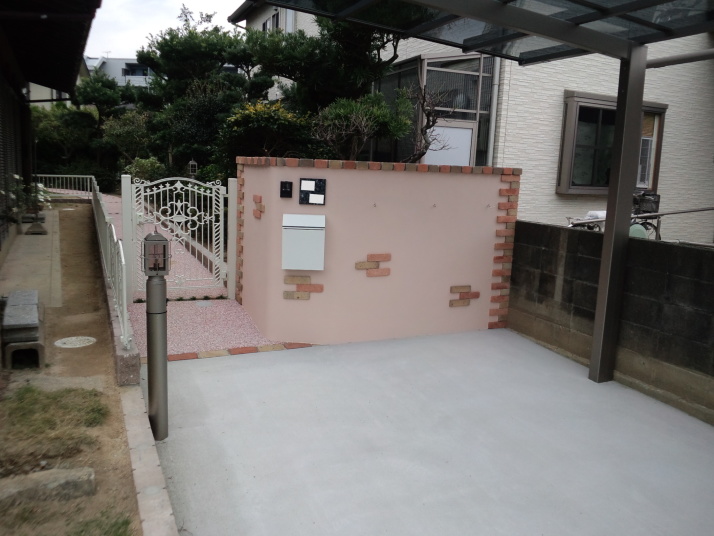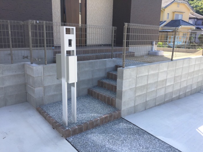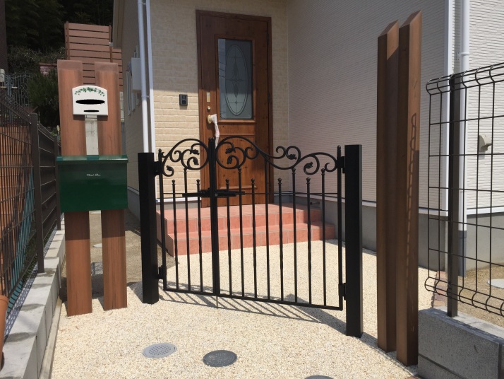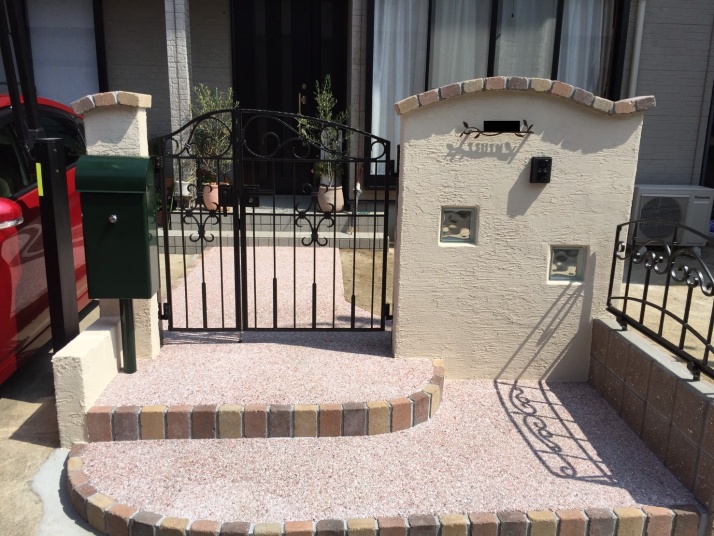 お客様手配.H銅門柱アイアン表札、土台コンクリート、階段ミルドブリック・コンクリート洗い出し |