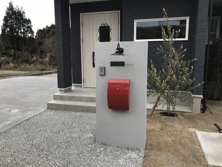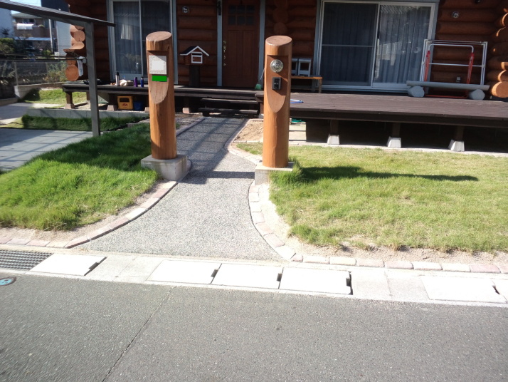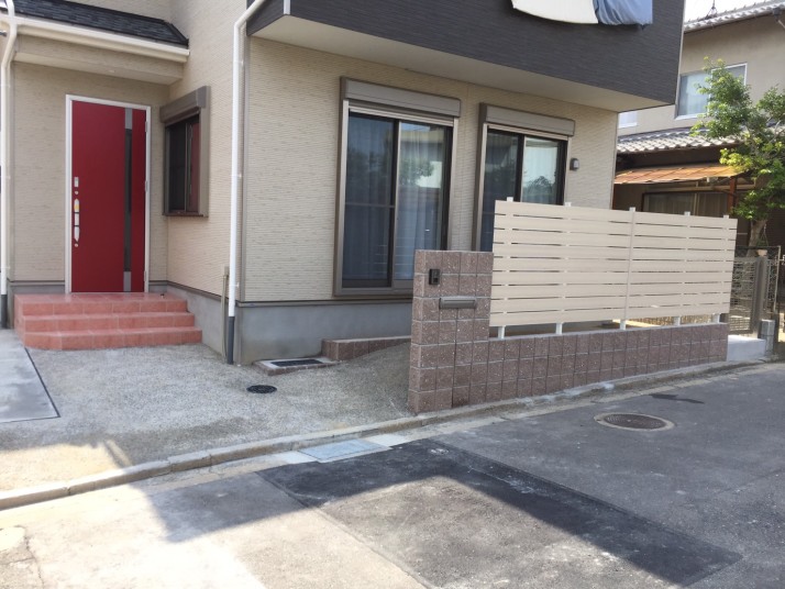 ユニソン.シャモティ1L積、リクシル.エクスポストN-1型、福彫表札.ALT-518、エクシスランド.Eウッドフェンス120板材9枚貼り、コンクリート洗い出し |