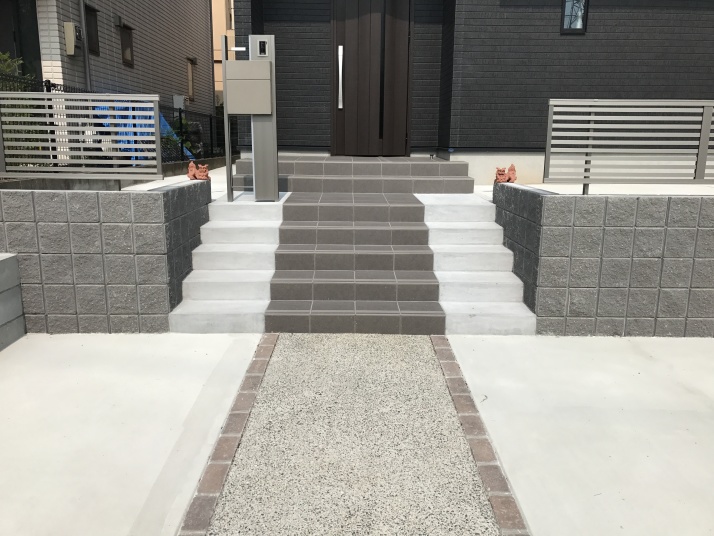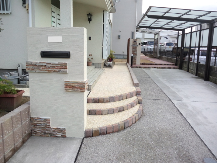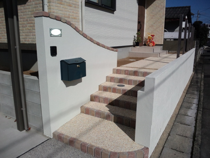 門塀ユニソン.シャモティ1L、笠木キャップボーダー、階段ミルドブリック・豆砂利洗出し、リクシル.エクスポストプレイン、手摺リクシルグリップライン |
