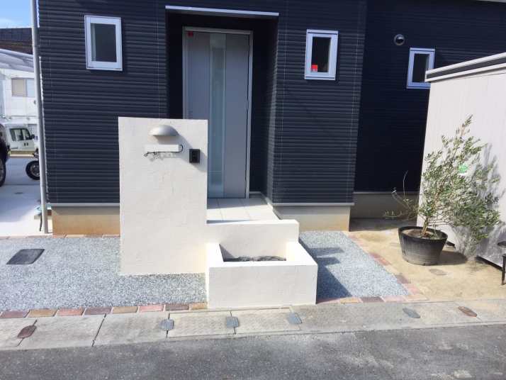 門塀.サハラペイブ笠木・ジョリパット仕上げ、レンガ目地.ベイクブリックペイブ、豆砂利洗い出し、玄関タイル.シクーロ300角貼り足し |