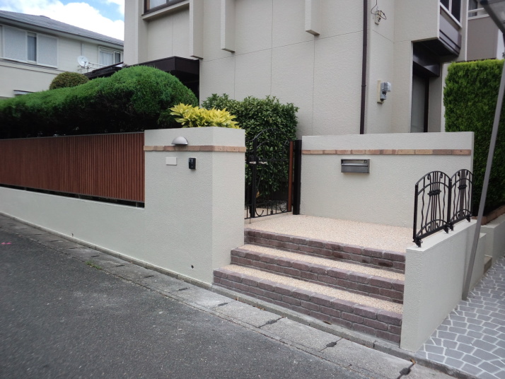 門塀 既存1段積み足し後、塗装 レンガアクセント、リクシル.エルマージュ1型親子門扉、階段ミルドブリック・豆砂利洗い出し、階段袖 リクシル.エルマージュ1型フェンス