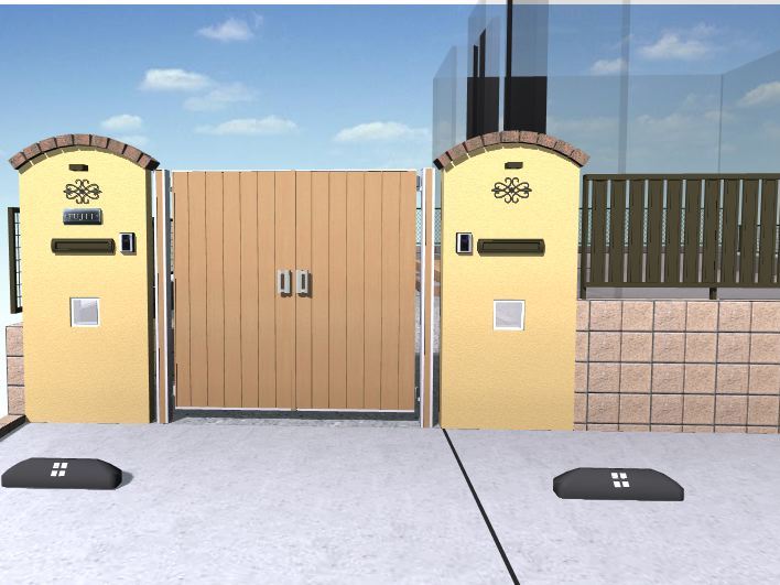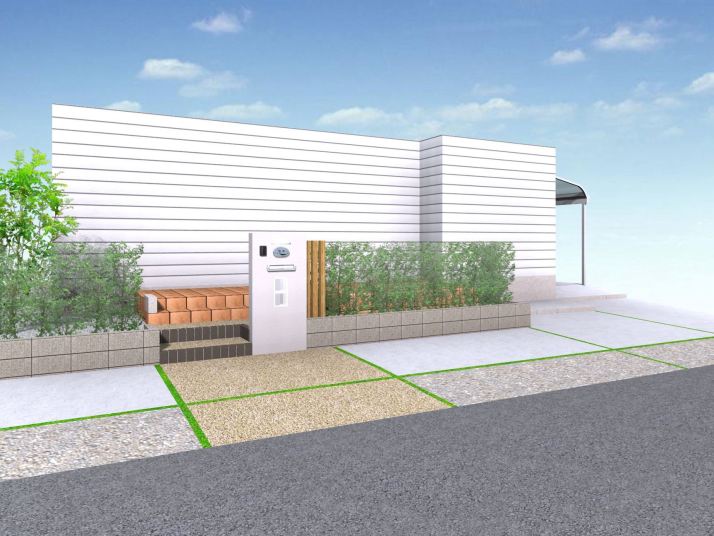 ユニソン.化粧ブロック シャモティル、ユニソン.レンガ ミルドブリック、アイカ.ジョリパット、Eランド.ベルストーン 平面、リクシル.プレスタ門扉2型、リクシル.ワイドオーバードアS2型、リクシル.カーポート