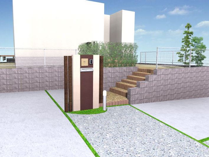 ユニソン.化粧ブロック アルバ、ユニソン.プログソリットブリックレンガ、アイカ.ジョリパット、Eランド.ベルストーン3面割肌、リクシル.ハイミレーヌR5型フェンス、リクシル.メジャーポートURタイプ、防草シート、砂利敷 |