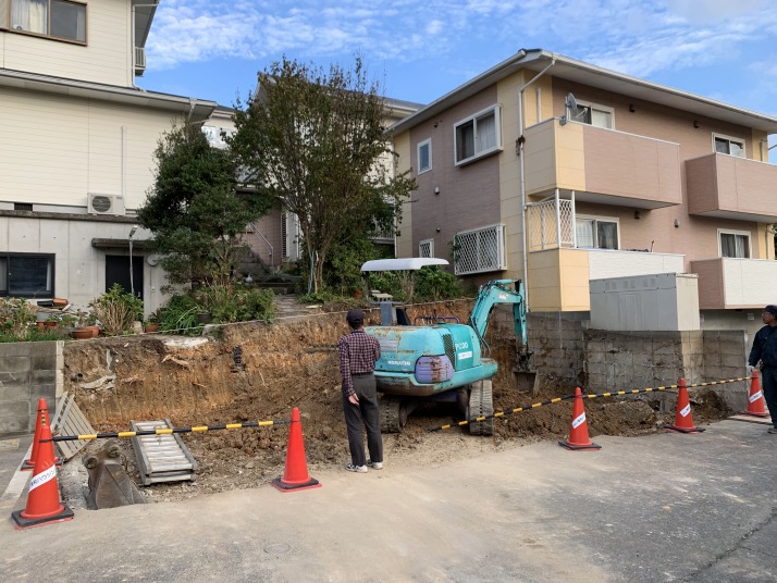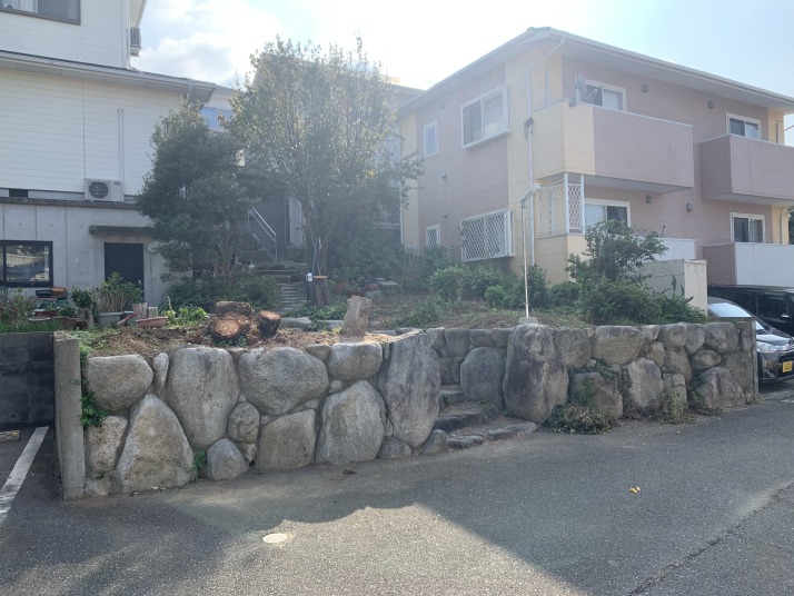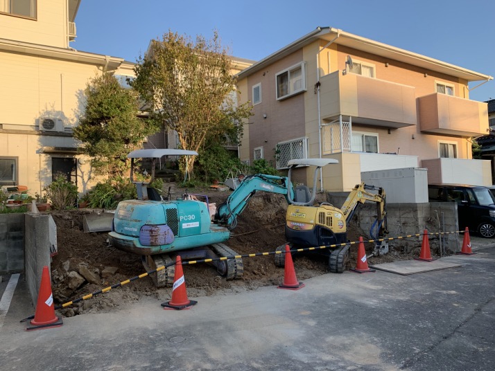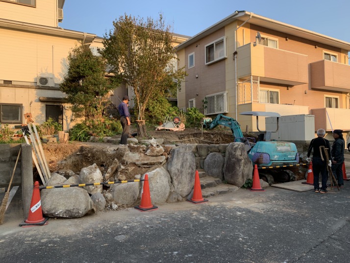樹木撤去、掘削、石粉敷 |